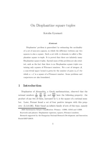 Gyarmati, Katalin (2025) On Diophantine square tuples. FIBONACCI QUARTERLY, 63 (3). pp. 554-569. ISSN 0015-0517