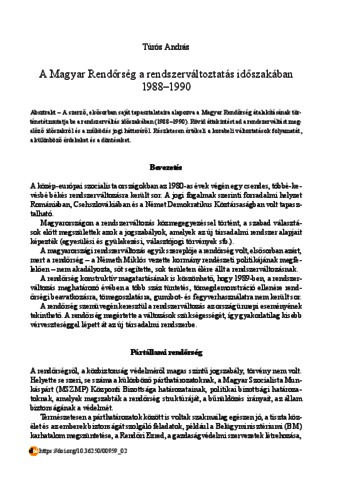 Túrós, András (2021) A Magyar Rendőrség a rendszerváltoztatás időszakában 1988–1990. In: A rendszerváltás hatása a rendészetre. Ludovika Egyetemi Kiadó, Budapest, pp. 25-36. ISBN 9789635315543; 9789635315567; 9789635315550