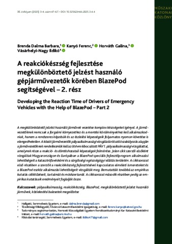 Brenda, Dalma Barbara and Kanyó, Ferenc and Horváth, Galina and Vásárhelyi-Nagy, Ildikó (2026) A reakciókészség fejlesztése megkülönböztető jelzést használó gépjárművezetők körében BlazePod segítségével : 2. rész = Developing the Reaction Time of Drivers of Emergency Vehicles with the Help of BlazePod : Part 2. MŰSZAKI KATONAI KÖZLÖNY, 35 (3–4). pp. 47-67. ISSN 1219-4166