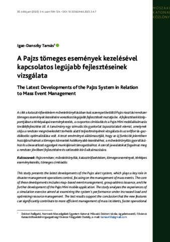 A cikk a katasztrófavédelem műveletirányításában kulcsszerepet betöltő Pajzs riasztási rendszer tömeges események kezelésére vonatkozó legújabb fejlesztéseit mutatja be. A fejlesztések középpontjában a térképalapú eseménykezelés, a csoportos címkiadás és a Pajzs Mini mobilalkalmazás továbbfejlesztése áll. A tanulmány egy szimulációs gyakorlat tapasztalatait elemzi, amelynek célja a rendszer megnövekedett terhelés alatti teljesítményének vizsgálata és az erőforrás-gazdálkodás optimalizálása volt. A teszt eredményei alátámasztják, hogy az új funkciók jelentősen hozzájárulhatnak a tömeges káresetek hatékonyabb kezeléséhez, a műveletirányítás gyorsításához és a beavatkozó egységek munkájának támogatásához. A szerző javaslatokat fogalmaz meg a rendszer jövőbeni fejlesztésére és szélesebb körű alkalmazására. | This study presents the latest developments of the Pajzs alert system, which plays a key role in disaster management operations control, focusing on the management of mass events. The core of these developments includes map-based event management, group address issuance, and the further development of the Pajzs Mini mobile application. The study analyzes the experiences of a simulation exercise aimed at examining the system’s performance under increased load and optimizing resource management. The test results support the conclusion that the new features can significantly contribute to more efficient management of mass incidents, faster operational control, and better support for responding units. Additionally, the study offers recommendations for the future development and broader implementation of the system.