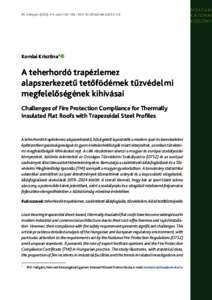 A teherhordó trapézlemez alapszerkezetű, hőszigetelt lapostetők a modern ipari és kereskedelmi építészetben gazdaságosságuk és gyors kivitelezhetőségük miatt elterjedtek, azonban tűzvédelmi megfelelőségük jelentős kihívásokat rejt. A cikk részletesen elemzi a magyar és európai szabályozási környezetet, különös tekintettel az Országos Tűzvédelmi Szabályzat (OTSZ) és az európai szabványok által támasztott követelményekre. Bemutatja a szakintézeti állásfoglalások és a Tűzvédelmi Megfelelőségi Igazolás (TMI) szerepét a magyar gyakorlatban. A tanulmány statisztikai adatokkal szemlélteti az ipari létesítmények tűzeseteinek arányát és a kapcsolódó vizsgálatok, állásfoglalások alakulását 2019–2024 között. A szerző kiemeli, hogy bár az ipari tüzek száma alacsony, a potenciális károk jelentősek, ezért a szabályozás és a vizsgálati módszerek folyamatos fejlesztése elengedhetetlen a tűzbiztonság növelése érdekében. | Load-bearing trapezoidal sheet-based, thermally insulated flat roofs have become widespread in modern industrial and commercial architecture due to their cost-effectiveness and rapid installation. However, their compliance with fire safety requirements presents significant challenges. This article provides a detailed analysis of the Hungarian and European regulatory environment, with particular attention to the requirements set by the National Fire Protection Regulations (OTSZ) and European standards. It presents the role of expert institute opinions and the Fire Protection Compliance Certificate (TMI) in Hungarian practice. The study illustrates, with statistical data, the proportion of fire incidents in industrial facilities and the trends in related investigations and expert opinions between 2019 and 2024. The author emphasizes that although the number of industrial fires is low, the potential damages are significant; therefore, the continuous development of regulations and testing methods is essential to enhance fire safety.