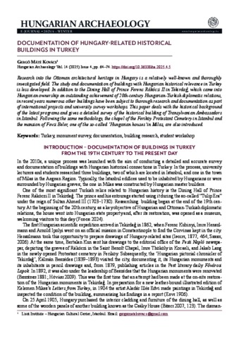 Kovács, Gergő Máté (2025) Documentation of Hungary-Related Historical Buildings in Turkey. HUNGARIAN ARCHAEOLOGY, 14 (4). pp. 64-74. ISSN 2416-0296