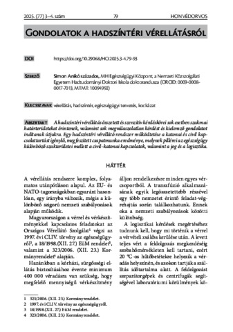 Simon, Anikó (2025) Gondolatok a hadszíntéri vérellátásról = Thoughts on Battlefield Blood Supply. HONVÉDORVOS, 77 (3-4). pp. 79-93. ISSN 0133-879X
