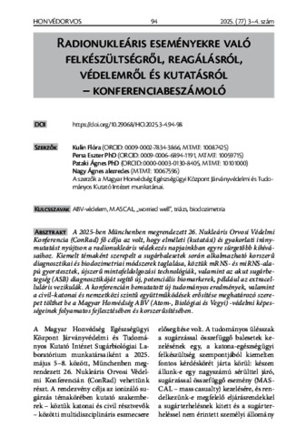 A 2025-ben Münchenben megrendezett 26. Nukleáris Orvosi Védelmi Konferencia (ConRad) fő célja az volt, hogy elméleti (kutatási) és gyakorlati iránymutatást nyújtson a radionukleáris védekezés napjainkban egyre sürgetőbb kihívá- saihoz. Kiemelt témaként szerepelt a sugárbalesetek során alkalmazható korszerű diagnosztikai és biodozimetriai módszerek taglalása, köztük mRNS- és miRNS-alapú gyorstesztek, újszerű mintafeldolgozási technológiák, valamint az akut sugárbetegség (ASB) diagnosztikáját segítő új, potenciális biomarkerek, például az extracelluláris vezikulák. A konferencián bemutatott új tudományos eredmények, valamint a civil–katonai és nemzetközi szintű együttműködések erősítése meghatározó szerepet tölthet be a Magyar Honvédség ABV (Atom-, Biológiai és Vegyi) -védelmi képességeinek folyamatos fejlesztésében és korszerűsítésében. = The main goal of the 26th Nuclear Medical Defense Conference (ConRad), held in Munich in 2025, was to provide both theoretical (research-based) and practical guidance for the increasingly urgent challenges of radionuclear defense. A highlighted topic was the discussion of advanced diagnostic and biodosimetric methods applicable in radiation accidents, including rapid mRNA- and miRNA-based tests, novel sample processing technologies, as well as new potential biomarkers – such as extracellular vesicles – that aid in the diagnosis of acute radiation syndrome (ARS). these new scientific findings, along with the establishment of civil-military and international collaborations deemed of outstanding importance at the conference, may lay the foundation for the continuous development of the Hungarian Defence Forces’ CBRN defense capabilities.