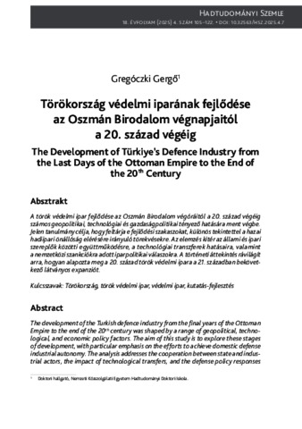 A török védelmi ipar fejlődése az Oszmán Birodalom végóráitól a 20. század végéig számos geopolitikai, technológiai és gazdaságpolitikai tényező hatására ment végbe. Jelen tanulmány célja, hogy feltárja e fejlődési szakaszokat, különös tekintettel a hazai hadiipari önállóság elérésére irányuló törekvésekre. Az elemzés kitér az állami és ipari szereplők közötti együttműködésre, a technológiai transzferek hatásaira, valamint a nemzetközi szankciókra adott iparpolitikai válaszokra. A történeti áttekintés rávilágít arra, hogyan alapozta meg a 20. század török védelmi ipara a 21. században bekövetkező látványos expanziót.