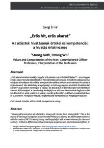 „Erős akarat minden akadályt legyőz, erős akarat csak erős hitből fakad” – ez a Magyar Királyi Jutasi Honvéd Altisztképző és Nevelőintézet jelmondata. Rövidített változata a mai napig az altisztképzés hitvallása, amelynek aktualitása várhatóan a következő évszázadra is fennmarad. Van különbség a legénységi, a tiszti vagy éppen az altiszti hivatástudat között? Alapvetően nemleges a válasz, de feladatuk és felelősségeik tekintetében vannak különbségek. A tanulmány körbejárja az altisztek hivatásának legfontosabb kérdéskörét és azok erkölcsi és etikai, morális jellemzőit, múltbeli visszatekintésben és a jelenben. Különös hangsúlyt helyez a legfontosabb kompetenciák megfogalmazására.