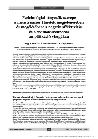 Nagy, Vivien and Hodossi, Nóra and Rigó, Adrien (2026) Pszichológiai tényezők szerepe a menstruációs tünetek megjelenésében és megélésében: a negatív affektivitás és a szomatoszenzoros amplifikáció vizsgálata = The role of psychological factors in the frequency and experience of menstrual symptoms: negative affect and somatosensory amplification. ORVOSI HETILAP, 167 (15). pp. 585-594. ISSN 0030-6002