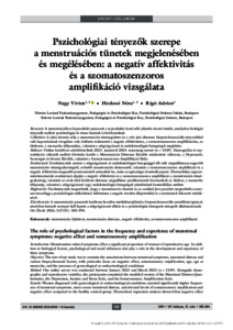 Bevezetés: A menstruációhoz kapcsolódó panaszok a reproduktív korú nők jelentős részét érintik, amelyeket biológiai tényezők mellett pszichológiai és társas hatások is befolyásolnak. Célkitűzés: A jelen kutatás célja a menstruációs tünetegyüttes és a vele járó distressz biopszichoszociális tényezőkkel való kapcsolatának vizsgálata volt, különös tekintettel a negatív affektivitásra, a szomatoszenzoros amplifikációra, az életkorra, a menarche időpontjára, valamint a nőgyógyászati és endokrinológiai betegségek meglétére. Módszer: Online kérdőíves adatfelvételünk 2023. januártól 2024. márciusig tartott (n = 1149). Demográfiai és reprodukciós változók mellett felvételre került a Menstruációs Distressz Kérdőív módosított változata, a Depresszió, Szorongás és Stressz Kérdőív, valamint a Szomatoszenzoros Amplifikáció Skála. Eredmények: Eredményeink szerint a nőgyógyászati és endokrinológiai betegséggel élő nők szignifikánsan nagyobb menstruációs tünetgyakoriságról, erősebb menstruációs distresszről, valamint a szomatoszenzoros amplifikáció és a negatív affektivitás magasabb pontszámáról számoltak be, mint az egészséges kontrollcsoport. Hierarchikus regresszióelemzéseink eredményei alapján a negatív affektivitás és a szomatoszenzoros amplifikáció a menstruációs tünetgyakoriság, valamint az ezek által kiváltott distressz szignifikáns prediktorainak bizonyultak az életkor, a menarche időpontja, valamint a nőgyógyászati vagy endokrinológiai betegségek jelenlétének kontrollálása mellett. Megbeszélés: Eredményeink megerősítik, hogy a menstruációs tünetek és az azokkal járó pszichés megterhelés szorosan összefügg a pszichológiai működéssel, különösen a negatív érzelmi állapotokkal és a testérzetek fokozott észlelésével. Következtetés: A menstruációs panaszok hatékony kezelése multidiszciplináris, biopszichoszociális szemléletet igényel, amelyben kiemelt szerepet kell kapnia a nőgyógyászati ellátás és a pszichológiai támogatás integrált alkalmazásának. Orv Hetil. 2026; 167(15): 585–594. | Introduction: Menstruation-related symptoms affect a significant proportion of women of reproductive age. In addi- tion to biological factors, psychological and social influences also play a role in the development and experience of these symptoms. Objective: The aim of our study was to examine the associations between menstrual symptoms, menstrual distress and various biopsychosocial factors, with particular focus on negative affect, somatosensory amplification, age, age at menarche, and the presence of gynecological or endocrinological conditions. Method: Our online survey was conducted between January 2023 and March 2024 (n = 1149). Alongside demo- graphic and reproductive variables, the participants completed the modified version of the Menstrual Distress Ques- tionnaire, the Depression, Anxiety and Stress Scale, and the Somatosensory Amplification Scale. Results: Women diagnosed with gynecological or endocrinological conditions reported significantly higher frequen- cies of menstrual symptoms, more severe menstrual distress, and elevated levels of somatosensory amplification and negative affect compared to the healthy control group. Hierarchical regression analyses showed that negative affect and somatosensory amplification were significant predictors of both symptom frequency and distress after controlling for age, age at menarche, and the presence of gynecological or endocrinological disorders. Discussion: Our findings confirm that menstrual symptoms and the associated psychological distress are closely linked to psychological functioning, particularly negative emotional states and heightened perception of bodily sensations. Conclusion: Effective management of menstrual symptoms requires a multidisciplinary, biopsychosocial approach, in which gynecological care and psychological support should be integrated.