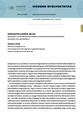 Ullmann, Cintia (2025) Szerkesztés határok nélkül : Beszámoló a HUN-REN Nyelvtudományi Kutatóközpont rendezvényéről. Budapest, 2024. november 20. MODERN NYELVOKTATÁS, 31 (1-2). pp. 204-206. ISSN 1219-638X