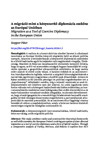 A realista és a konstruktivista elméleti keretet is alkalmazótanulmány az Európai Unióba irányuló migráción belül az állami politikaszerepét, valamint a bevándorlásnak a kényszerítő diplomáciai eszközkéntés a hibrid hadviselés egyik formájaként való megjelenését vizsgálja. Török- ország, Marokkó és Belarusz összehasonlító elemzésén keresztül feltárja,hogy az egyes, az EU-val szomszédos országok hogyan használják fel a migrációs nyomást a geopolitikai alkupozíciójuk erősítésére, és hogy azokramiért alakult ki eltérő uniós válasz. A hatalmi érdekek és az aszimmetrikus interdependencia logikája, valamint a migráció biztonságiasításának anarratívája együttesen magyarázza a konfliktusok dinamikáját. Ankara ésRabat esetében az EU jelentős pénzügyi és politikai engedményeket tett a„kapuőrszerep” vállalásáért cserébe, míg a minszki rezsimnek az azok ki- kényszerítésére tett kísérlete nem járt sikerrel. Az uniós jogalkotás terénfontos változás volt a Schengeni határellenőrzési kódex módosítása, az instrumentalizációs rendelettervezet kidolgozása (bár utóbb elvetették) és a vismaior helyzetekre vonatkozó rendelet elfogadása. Az elemzés következtetése, hogy a határigazgatási és a menekültügyi feladatoknak harmadik országokba történő részleges kiszervezése megerősítette a partnerállamok alku- pozícióját és zsarolási potenciálját. Ez az aszimmetrikus függőségi viszonyhozzájárult ahhoz a csapdahelyzethez, amely a belorusz határon kialakultmesterséges migrációs válságban csúcsosodott ki. | This study combines realist and constructivist theoretical frameworks as well while examines the European Union’s evolving perception of state-directed migration as a tool of coercive diplomacy and a form of hybrid warfare. Through a comparative analysis of Turkey, Morocco, and Belarus it explores how EU’s neighboring states have instrumentalized migratory pressure to strengthen their geopolitical bargaining positions, and why the EU’s responses have differed across cases. Power asymmetries, strategic interests, and the securitization of migration as a narrative process shape political preferences and institutional outcomes. Ankara and Rabat demonstrate that the EU has granted significant financial and political concessions in exchange for a “gatekeeper” role but the Minsk regime’s attempt to coerce the EU into concessions ultimately failed. The study also reviews the EU’s legislative responses: the amendment of the Schengen Borders Code, the drafting of the proposed Instrumentalization Regulation (it was not adopted), and the 2024 regulation addressing situations of force majeure. It argues that the partial outsourcing of border control and asylum responsibilities to third countries has strengthened these partners’ bargaining leverage and increased their potential for coercion. This structural interdependence created a political trap that culminated in the artificially generated migration crisis at the borders of Belarus.