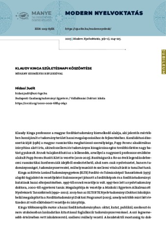 Hidasi, Judit (2025) Klaudy Kinga születésnapi köszöntése néhány személyes reflexióval. MODERN NYELVOKTATÁS, 31 (1-2). pp. 224-225. ISSN 1219-638X