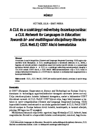 Hüttner, Julia and Bakti, Mária (2024) A CLIL és a szaktárgyi műveltség összekapcsolása: a CLIL Network for Languages in Education: Towards bi- and multilingual disciplinary literacies (CLIL NetLE) COST Akció bemutatása. MODERN NYELVOKTATÁS, 30 (3-4). pp. 118-128. ISSN 1219-638X