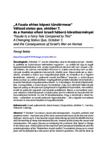 „Október 7.”, annak mibenléte, okai és következményei – közéleti, politikai és tudományos tekintetben egyaránt – az utóbbi bő egy év egyik legvitatottabb kérdése volt, amely meghatározó témává vált nem csupán a Közel-Keleten, de számos nemzetközi fórumon is. A jelen tanulmány nem az előzmények további vizsgálatára koncentrál, inkább azon folyamatoknak az elemzésére, amelyek a status quo megváltozását jelzik. Az empirikus és a fogalmi kereteknek, valamint a „palesztin–izraeli konfliktus” kapcsán a tudományos diskurzusban az utóbbi években megfigyelhető problematizálás ismertetését a kutatási kérdések megválaszolása követi. Ez másodlagos források (folyóiratcikkek, monográfiák), a tudományos forrásokban még nem elérhető fejlemények kapcsán pedig az oknyomozó újságírással is foglalkozó hírportálok, nemzetközi, izraeli és palesztin jogvédő szervezetek publikációi, illetve a nemzetközi rendszer releváns intézményeinek a határozatai, kommunikációi és beszámolói felhasználásával történik. Az írás fő következtetése, hogy a történtek a Közel-Keletet – szűkebben az izraeli–palesztin kapcsolatokat –, sőt a tágabb nemzetközi rendszert is visszavonhatatlanul megváltoztatták. | “7 October”, its nature, causes and consequences – in public, political, and academic terms – has been one of the most controversial issues of the last one and a half year, and as such, it has become a topic determining not only the Middle East but also the working of many international forums. Instead of discussing the causes and consequences, this paper focuses on analysing the processes that signal a change in the status quo. A description of the empirical and conceptual frameworks and the problematization of the “Palestinian–Israeli conflict” in academic discourse in recent years will be followed by a discussion of the research questions. This will be done by using secondary sources (journal articles, monographs), and, for developments not yet available in academic sources, news portals including investigative journalism, publications by international, Israeli, and Palestinian human rights organizations, and the decisions, communications, and reports of international organizations. The main conclusion of the paper is that the events have not only irrevocably changed the Middle East, the dynamics of the Israeli–Palestinian relations, but also affected the wider international system.