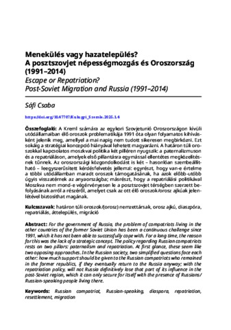 Menekülés vagy hazatelepülés? : A posztszovjet népességmozgás és Oroszország (1991–2014) = Escape or Repatriation? Post-Soviet Migration and Russia (1991–2014)