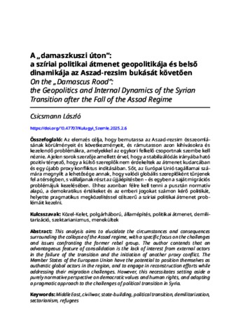 Csicsmann, László (2025) A „damaszkuszi úton”: a szíriai politikai átmenet geopolitikája és belső dinamikája az Aszad-rezsim bukását követően = On the „Damascus Road”: the Geopolitics and Internal Dynamics of the Syrian Transition after the Fall of the Assad Regime. KÜLÜGYI SZEMLE, 24 (2). pp. 94-113. ISSN 1587-9089 (nyomtatott); 2060-4904 (online)