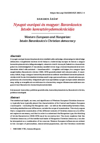 A nyugat-európai kereszténydemokrácia intellektuális mélysége, sikeressége és jelentősége jellemzően vizsgálódási kereten kívül helyezi a kelet-közép-európai és benne a magyar kereszténydemokrácia jellegzetességeit, valamint a kettő viszonyát (beleértve a hasonlóságokat és a különbségeket). E tanulmány amellett érvel, hogy a kereszténydemokrácia területenként eltérő változatainak – összehasonlító – vizsgálata szükséges, és a magyar típus megértéséhez Barankovics István (1906–1974) gondolkodását kell rekonstruálni. A tanulmány kifejti, hogy a magyar kereszténydemokrácia szellemi vezetőjének kereszténydemokráciája is két forrás ötvözéseként értelmezendő: míg a perszonalizmus, a demokratizmus-popularizmus és a keresztény világnézeti párt koncepciójában nyugat-európai szálak jelennek meg, addig az evangéliumi szocializmus és a keresztény magyar állameszme sajátosan magyarrá teszi Barankovics kereszténydemokráciáját. | The intellectual depth, success, and significance of Western European Christian democracy typically have typically placed the characteristics of its Central and Eastern European counterparts – including the Hungarian case – as well as the relationship between them, including similarities and differences, outside the scope of examination. This study argues that a comparative examination of the different variants of Christian democracy in different regions is necessary, and that in order to understand the Hungarian type, the thinking of István Barankovics (1906-1974) must be reconstructed. The study explains that the Christian democracy of the intellectual leader of Hungarian Christian democracy can also be interpreted as a combination of two sources: Western European influences are evident in his concepts of personalism, demorcatism-popularism, and the Christian worldview party, whereas Evangelical socialism and the Christian Hungarian state concept make Barankovics’ Christian democracy uniquely Hungarian.