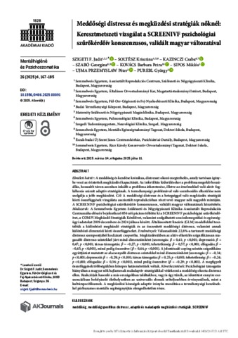 Szigeti F., Judit and Soltész, Krisztina and Kazinczi, Csaba and Szabó, Georgina Irén and Kovács, Barbara Petra and Sipos, Miklós and Ujma, Przemyslaw Péter and Purebl, György (2025) Meddőségi distressz és megküzdési stratégiák nőknél: Keresztmetszeti vizsgálat a SCREENIVF pszichológiai szűrőkérdőív konszenzusos, validált magyar változatával = Infertility distress and coping strategies in women. A cross-sectional study with the consensual, validated Hungarian version of the SCREENIVF psychological screening questionnaire. MENTÁLHIGIÉNÉ ÉS PSZICHOSZOMATIKA, 26 (4). pp. 167-185. ISSN 1419-8126