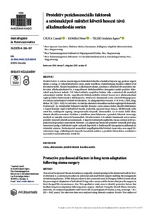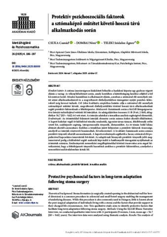 Csuka, Csanád and Dombai, Nóra and Teleki, Szidalisz Ágnes (2025) Protektív pszichoszociális faktorok a sztómaképző műtétet követő hosszú távú alkalmazkodás során = Protective psychosocial factors in long-term adaptation following stoma surgery. MENTÁLHIGIÉNÉ ÉS PSZICHOSZOMATIKA, 26 (4). pp. 186-197. ISSN 1419-8126