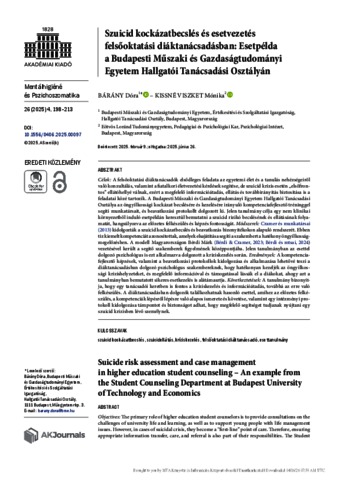 Célok: A felsőoktatási diáktanácsadók elsődleges feladata az egyetemi élet és a tanulás nehézségeiről való konzultálás, valamint a fiatalkori életvezetési kérdések segítése, de szuicid krízis esetén „elsőfrontos” ellátóhellyé válnak, ezért a megfelelő információátadás, ellátás és továbbirányítás biztosítása is a feladatai közé tartozik. A Budapesti Műszaki és Gazdaságtudományi Egyetem Hallgatói Tanácsadási Osztálya az öngyilkossági kockázat becslésére és kezelésére irányuló kompetenciafejlesztő tréninggel segíti munkatársait, és beavatkozási protokollt dolgozott ki. Jelen tanulmány célja egy nem klinikai környezetből induló esetpéldán keresztül bemutatni a szuicid rizikó becslésének és ellátásának folyamatát, hangsúlyozva az előzetes felkészülés és képzés fontosságát. Módszerek: Cramer és munkatársai (2013) kidolgozták a szuicid kockázatbecslés és beavatkozás bizonyítékokon alapuló rendszerét. Ebben tíz kiemelt kompetenciát azonosítottak, amelyek elsajátítása segíti a szakembert a hatékony öngyilkosság- megelőzésben. A modell Magyarországon Bérdi Márk (Bérdi & Cramer, 2023; Bérdi és mtsai, 2024) vezetésével került a segítő szakemberek figyelmének középpontjába. Jelen tanulmányban az esettel dolgozó pszichológus is ezt alkalmazva dolgozott a kríziskezelés során. Eredmények: A kompetenciafejlesztő képzések, valamint a beavatkozási protokollok kidolgozása és alkalmazása lehetővé teszi a diáktanácsadásban dolgozó pszichológus szakembereknek, hogy hatékonyan kezeljék az öngyilkossági krízishelyzeteket, és megfelelő információval és támogatással lássák el a diákokat, ahogy azt a tanulmányban bemutatott sikeres esetkezelés is alátámasztja. Következtetések: A tanulmány bizonyítja, hogy egy tanácsadói keretben is fontos a kríziskezelés és információátadás, továbbá az erre való felkészülés. A diáktanácsadásban dolgozók találkozhatnak hasonló esettel, amihez az előzetes felkészülés, a kompetenciák lépésről lépésre való alapos ismerete és követése, valamint egy intézményi protokoll kidolgozása támpontot és biztonságot adhat, hogy megfelelő segítséget tudjanak nyújtani egy szuicid krízisben lévő személynek. | Objectives: The primary role of higher education student counselors is to provide consultations on the challenges of university life and learning, as well as to support young people with life management issues. However, in cases of suicidal crisis, they become a “first-line” point of care. Therefore, ensuring appropriate information transfer, care, and referral is also part of their responsibilities. The Student Counseling Department at the Budapest University of Technology and Economics supports its staff with a competency development training focused on suicide risk assessment and management, and has developed an intervention protocol. The aim of this study is to present the process of suicide risk assessment and care through a case example originating from a non-clinical setting, emphasizing the importance of prior preparation and training. Methods: Cramer et al. (2013) developed an evidence-based system for suicide risk assessment and intervention. This model identifies ten key competencies that, when acquired, help professionals effectively prevent suicide. In Hungary, the model has been brought to the attention of helping professionals under the leadership of Márk Bérdi (Bérdi & Cramer, 2023; Bérdi et al., 2024). In the present study, the psychologist working on the case also applied this model during crisis intervention. Results: Competency development training and the development and application of intervention protocols enable psychologists working in student counseling to effectively manage suicidal crises and provide students with appropriate information and support, as demonstrated by the successful case management presented in the study. Conclusions: The study demonstrates that crisis management and information transfer are important even within a counseling framework, and that preparation for such situations is essential. Student counselors may encounter similar cases, for which prior preparation, thorough knowledge and application of the competencies, and the development of an institutional protocol can provide guidance and security to offer appropriate help to individuals in suicidal crisis.