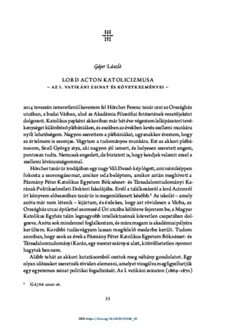 Gájer, László (2026) Lord Acton katolicizmusa: Az I. vatikáni zsinat és következményei. In: A polgárság erénye és bölcsessége. Ludovika Egyetemi Kiadó, Budapest, pp. 55-66. ISBN 9789636532024