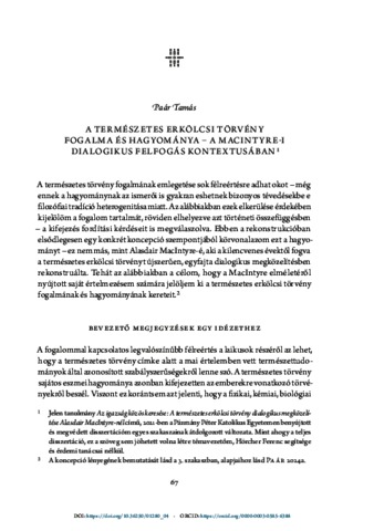 Paár, Tamás (2026) A természetes erkölcsi törvény fogalma és hagyománya a macintyre-i dialogikus felfogás kontextusában. In: A polgárság erénye és bölcsessége. Ludovika Egyetemi Kiadó, Budapest, pp. 67-87. ISBN 9789636532024