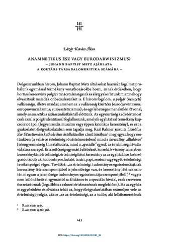 Lázár-Kovács, Ákos (2026) Anamnetikus ész vagy eurodarwinizmus? : Johann Baptist Metz ajánlata a kortárs társadalomkritika számára. In: A polgárság erénye és bölcsessége. Ludovika Egyetemi Kiadó, Budapest, pp. 143-160. ISBN 9789636532024