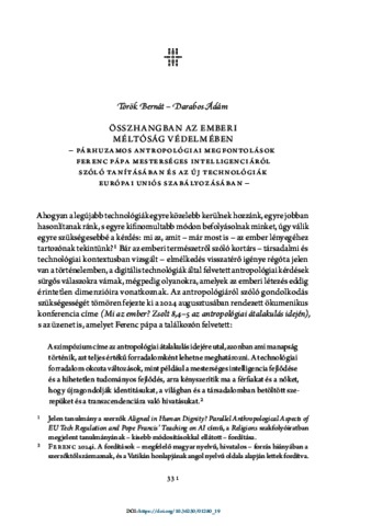 Török, Bernát and Darabos, Ádám (2026) Összhangban az emberi méltóság védelmében : Párhuzamos antropológiai megfontolások Ferenc pápa mesterséges intelligenciáról szóló tanításában és az új technológiák európai uniós szabályozásában. In: A polgárság erénye és bölcsessége. Ludovika Egyetemi Kiadó, Budapest, pp. 331-359. ISBN 9789636532024; 9789636532031