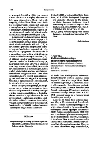 M. Pintér Tibor: A bibliafordítás tudománya. Bibliafordításról nyelvész szemmel. Budapest: Károli Gáspár Református Egyetem – L’Harmattan Kiadó – Hermeneutikai Kutatóközpont. 2023, 222 p. ISBN 978-963-646-065-5