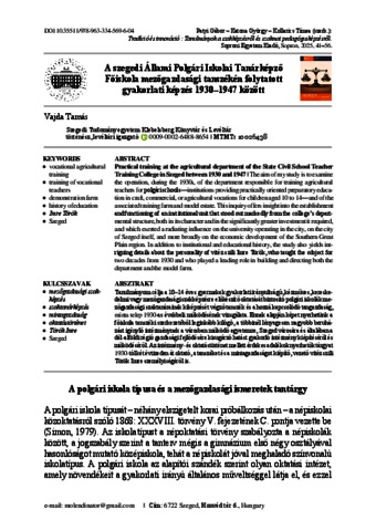 Tanulmányom célja a 10–14 éves gyermekek gyakorlati irányultságú, kézműves, kereskedelmi vagy mezőgazdasági szakképzésre előkészítő oktatását biztosító polgári iskolák mezőgazdasági szaktanárainak kiképzését végző tanszék és a hozzá kapcsolódó tangazdaság,minta telep 1930-as évekbeli működésének vizsgálata. Ennek alapján képet nyerhetünk afőiskola tanszéki szerkezetéből leginkább kilógó, a többinél lényegesen nagyobb beruházást igénylő intézménynek a városban működő egyetemre, Szeged városára és általában adél-alföldi régió gazdasági fejlődésére kisugárzó hatást gyakorló intézmény kiépítéséről ésműködéséről. Az intézmény- és oktatástörténet mellett érdekes adalékok nyerhetők tárgyat1930-tól két évtizeden át oktató, a tanszéket és a mintagazdaságot kiépítő, vezető vitéz sziliTörök Imre személyiségéről is. | The aim of my study is to examine the operation, during the 1930s, of the department responsible for training agricultural teachers for polgári schools—institutions providing practically oriented preparatory education in craft, commercial, or agricultural vocations for children aged 10 to 14—and of the associated training farm and model estate. This inquiry offers insight into the establishment and functioning of an institutional unit that stood out markedly from the college’s departmental structure, both in its character and in the significantly greater investment it required, and which exerted a radiating influence on the university operating in the city, on the city of Szeged itself, and more broadly on the economic development of the Southern Great Plain region. In addition to institutional and educational history, the study also yields intriguing details about the personality of vitéz szili Imre Török, who taught the subject for two decades from 1930 and who played a leading role in building and directing both the department and the model farm.