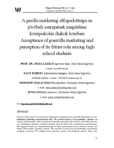 Józsa, László and Nagy, Róbert and Módosné Szalai, Szilvia and Jenei, Szonja (2026) A gerilla marketing elfogadottsága és jövőbeli szerepének megítélése középiskolás diákok körében = Acceptance of guerrilla marketing and perception of its future role among high school students. MAGYAR MINŐSÉG, 35 (2). pp. 46-63. ISSN 1416-9576