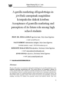 A tanulmány célja annak vizsgálata, hogy a középiskolás diákok miként viszonyulnak a gerilla marketinghez mint nem hagyományos marketingkommunikációs eszközhöz. A kutatás arra fókuszál, hogy a válaszadók mennyire nyitottak a kreatív reklámokra, hogyan értékelik a gerilla marketinget, milyen mértékben érzékelik azt zavarónak vagy tolakodónak, valamint hogyan ítélik meg e reklámforma jövőbeli szerepét. Az empirikus vizsgálat online kérdőíves adatfelvétellel zajlott 2026 januárja és márciusa között, három középiskolában. A nem valószínűségi, kényelmi mintavételen alapuló kutatásban 593 gimnáziumi és technikumi tanuló vett részt. Az adatok feldolgozása SPSS statisztikai program segítségével történt, leíró statisztikák és kereszttáblás elemzések alkalmazásával, a kapcsolatok vizsgálatához khi-négyzet próbát használva. Az eredmények alapján a középiskolás diákok alapvetően pozitívan viszonyulnak a gerilla marketinghez: elsősorban kreatív, figyelemfelkeltő és emlékezetes reklámeszközként tekintenek rá. Ugyanakkor a megítélés nem egységes, mivel a válaszadók egy része bizonyos formáit zavarónak vagy nem minden márkához illeszkedőnek tartja. A kutatás szignifikáns összefüggést talált a nem és a gerilla marketing megítélése, az életkor és a kreatív reklámokra való nyitottság, valamint az iskolatípus és a gerilla marketing jövőbeli szerepének megítélése között. A tanulmány hozzájárul a gerilla marketing fogyasztói percepciójának jobb megértéséhez a fiatalabb korosztály körében, és rámutat arra, hogy a kreatív reklámmegoldások alkalmazásakor a célcsoport-specifikus sajátosságok kiemelt jelentőséggel bírnak. | The aim of this study is to examine how high school students perceive guerrilla marketing as a nontraditional marketing communication tool. The research focuses on respondents’ openness to creative advertisements, their evaluation of guerrilla marketing, the extent to which they perceive it as disturbing or intrusive, and their opinions about its future role in marketing communication. The empirical study was conducted through an online questionnaire survey between January and March 2026 in three secondary schools. The research was based on non-probability convenience sampling, involving 593 students from grammar schools and technical schools. Data were processed using SPSS statistical software by applying descriptive statistics and cross-tabulation analysis, while chi-square tests were used to examine relationships between the variables. The findings indicate that high school students generally have a positive attitude toward guerrilla marketing, primarily perceiving it as a creative, attention-grabbing, and memorable advertising tool. At the same time, the evaluation is not uniform, as some respondents consider certain forms of guerrilla marketing disturbing or unsuitable for all brands. The study found significant relationships between gender and the perception of guerrilla marketing, age and openness to creative advertising, as well as school type and the perceived future role of guerrilla marketing. The study contributes to a better understanding of consumer perceptions of guerrilla marketing among younger age groups and highlights the importance of target-group-specific characteristics when applying creative advertising solutions.