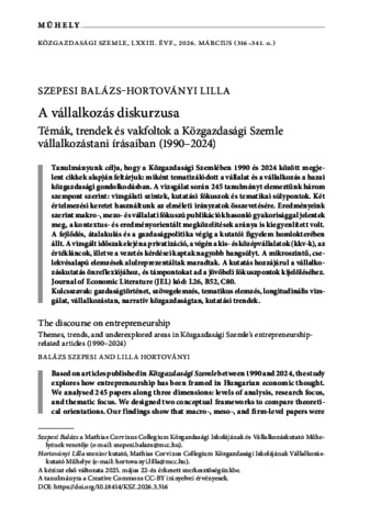 Szepesi, Balázs and Hortoványi, Lilla (2026) A vállalkozás diskurzusa : témák, trendek és vakfoltok a Közgazdasági Szemle vállalkozástani írásaiban (1990-2024) = The discourse on entrepreneurship : Themes, trends, and underexplored areas in Közgazdasági Szemle’s entrepreneurshiprelated articles (1990–2024). KÖZGAZDASÁGI SZEMLE, 73 (3). pp. 316-341. ISSN 0023-4346