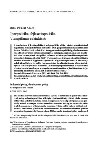 A tanulmány a fejlesztéspolitika és az iparpolitika néhány vitatott vonatkozásával foglalkozik, Mihályi Péternek a hozzáadott érték iparpolitikai alkalmazását kritizáló írására (Mihályi, 2026) reflektálva. A magyar struktúrapolitikai gyakorlat rendszerint a külső környezet változásaira reagált, a hazai gazdasági rendszer nem szándékolt következményeinek korrigálását, valamint politikai preferenciák érvényesítését szolgálta. A hozzáadott érték (GDP) evidens mérce, a tényleges fejlesztéspolitikára azonban szituációtól függő minták jellemzők. Magyarországon 2010-től a hazai bajnokok kiemelésére, a termelési volumennek és a foglalkoztatásnak a növelésére irányult a struktúrapolitika, mellőzve a termelékenységi szempontot. Hosszabb időt tekintve kimutatható, hogy a versenyviszonyok deformálása, a járadékvadászat terjedése rontja az erőforrás-allokációt, és ütemvesztéshez vezet. | The study deals with some controversial aspects of development policy and industrial policy, reflecting on Péter Mihályi’s criticism (Mihályi, 2026) of the overuse of the value added in industrial policy. Hungarian structural policy practice has generally reacted to changes in the external environment, serving to correct the unintended consequences of the domestic economic system, and to enforce political preferences. Value added (GDP) is an obvious measure, but actual development policies are context dependent. In Hungary, from 2010 onwards, structural policy has focused on the promotion of domestic champions, and increasing production volumes and employment, neglecting the productivity aspects. The distortion of the competitive landscape and the spread of rent-seeking behaviour have demonstrably impaired resource allocation and lead to a loss of momentum.