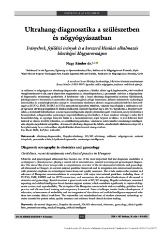 A szülészeti és nőgyógyászati ultrahang-diagnosztika napjainkra a klinikai ellátás egyik legfontosabb, első vonalbeli vizsgálómódszerévé vált, amely alapvetően meghatározza a várandósgondozás, a praenatalis szűrés és a nőgyógyászati diagnosztika mindennapi gyakorlatát. A közlemény célja a hazai ultrahang-diagnosztikai rendszer fejlődésének, jelenlegi irányelvi hátterének és nemzetközi beágyazottságának átfogó bemutatása, különös tekintettel a technológiai innovációkra és a minőségbiztosítás szerepére. A tanulmány részletesen elemzi a magyar ajánlások helyét és korszerűségét az ISUOG, FMF, ESHRE és IOTA nemzetközi irányelvek tükrében, valamint összefoglalja a szülészeti és nőgyógyászati ultrahangvizsgálatok fő klinikai indikációit. Kiemelt figyelmet kap a 3D/4D képalkotás, a Doppler-technikák, a strukturált leletalkotás és a mesterséges intelligencián alapuló döntéstámogató rendszerek, amelyek jelentősen hozzájárulnak a diagnosztikai pontosság és reprodukálhatóság növeléséhez. A hazai rendszer erőssége a széles körű hozzáférhetőség, az egységes irányelvi háttér és a licenctanúsítvány-alapú képzési struktúra. A jövő kihívásai közé tartozik az oktatás további fejlesztése, az auditálhatóság erősítése, valamint az adatvezérelt és mesterséges intelligencián alapuló megoldások integrálása. A korszerű ultrahang-diagnosztika felelős, standardizált alkalmazása alapvető a betegbiztonság és az evidenciákon alapuló klinikai döntéshozatal támogatásában. Orv Hetil. 2026; 167(16): 610–620. | Obstetric and gynecological ultrasound has become one of the most important first-line diagnostic modalities in contemporary clinical practice, playing a central role in antenatal care, prenatal screening and gynecological diagnos- tics. The aim of this review is to provide a comprehensive overview of the development of obstetric and gynecologi- cal ultrasound in Hungary, its current national guideline framework and its integration into international standards, with particular emphasis on technological innovations and quality assurance. The article analyzes the position and relevance of Hungarian recommendations in comparison with major international guidelines, including those of ISUOG, FMF, ESHRE and the IOTA consortium, and summarizes the main clinical indications of ultrasound in obstetrics and gynecology. Special attention is given to the role of 3D/4D imaging, Doppler techniques, structured reporting and artificial intelligence-based decision support systems, which contribute significantly to improved diag- nostic accuracy and reproducibility. The strengths of the Hungarian system include wide accessibility, guideline-based practice and a license-based training and competency framework. Future challenges involve further development of education, enhancement of auditability and the integration of data-driven and artificial intelligence-supported solu- tions into routine clinical workflows. The responsible and standardized use of modern ultrasound technology re- mains essential for patient safety, quality assurance and evidence-based clinical decision-making.