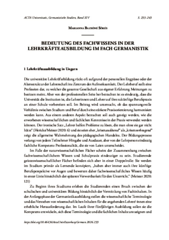 Bazsóné Sőrés, Marianna (2026) Bedeutung des Fachwissens in der Lehrkräfteausbildung im Fach Germanistik. ACTA UNIVERSITATIS DE CAROLO ESZTERHÁZY NOMINATE: GERMANISTISCHE STUDIEN, 14. pp. 233-243. ISSN 26309513