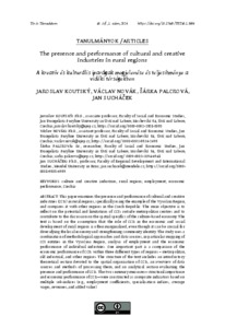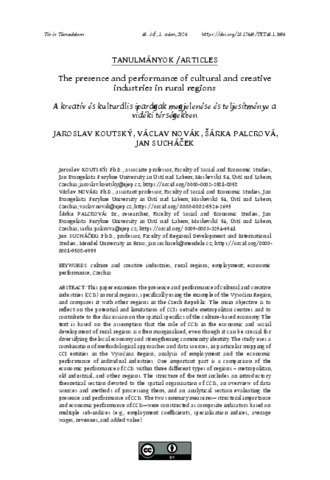 Koutský, Jaroslav and Novák, Václav and Palcrová, Šárka and Suchacek, Jan (2026) The presence and performance of cultural and creative industries in rural regions = A kreatív és kulturális iparágak megjelenése és teljesítménye a vidéki térségekben. TÉR ÉS TÁRSADALOM, 40 (1). pp. 3-27. ISSN 0237-7683 (nyomtatott); 2062-9923 (online)