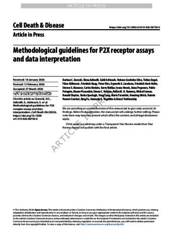 C. Gorecki, Dariusz and Adinolfi, Elena and Adriouch, Sahil and Coutinho-Silva, Robson and Engel, Tobias and Gölöncsér, Flóra and Haag, Friedrich and Illés, Péter and A. Jacobson, Kenneth and Koch-Nolte, Friedrich and E. Mansoor, Steven and Matute, Carlos and Melino, Gerry and Novak, Ivana and Pegoraro, Anna and Pelegrin, Pablo and Piacentini, Mauro and C. Robson, Simon and M. H. Rumney, Robin and Seman, Michel and Sluyter, Ronald and Sperlágh, Beáta and Tang, Yong and Tarantini, Mario and Ulrich, Henning and Vouret-Craviari, Valerie and Ye, Qing and G. Yegutkin, Gennady and Verkhratsky, Alexei (2026) Methodological guidelines for P2X receptor assays and data interpretation. CELL DEATH AND DISEASE. ISSN 2041-4889 (In Press)