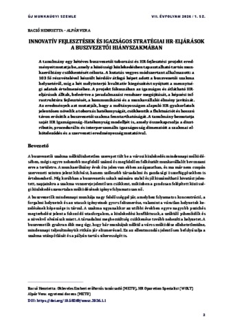 Bacsó, Henrietta and Alpár, Vera (2026) Innovatív fejlesztések és igazságos stratégiai HR-eljárások a buszvezetői hiányszakmában. ÚJ MUNKAÜGYI SZEMLE, 7 (1). pp. 2-20. ISSN 2677-1306