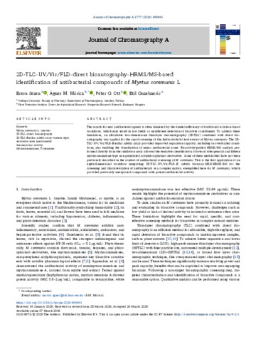 Sezen, Ecesu and Móricz, Ágnes and Ott, Péter and Guzelmeric, Etil (2026) 2D-TLC–UV/Vis/FLD–direct bioautography–HRMS/MS-based identification of antibacterial compounds of Myrtus communis L. JOURNAL OF CHROMATOGRAPHY A, 1777. ISSN 0021-9673