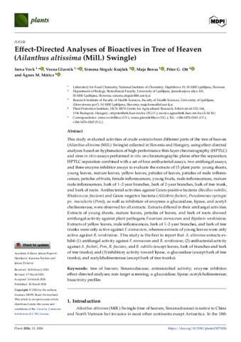 Vovk, Irena and Glavnik, Vesna and Strgulc Krajšek, Simona and Bensa, Maja and Ott, Péter and Móricz, Ágnes (2026) Effect-Directed Analyses of Bioactives in Tree of Heaven (Ailanthus altissima (Mill.) Swingle). PLANTS-BASEL, 15 (7). ISSN 2223-7747