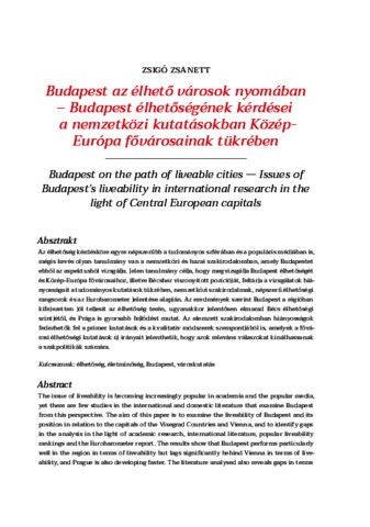 Az élhetőség kérdésköre egyre népszerűbb a tudományos szférában és a populáris médiában is, mégis kevés olyan tanulmány van a nemzetközi és hazai szakirodalomban, amely Budapestet ebből az aspektusból vizsgálja. Jelen tanulmány célja, hogy megvizsgálja Budapest élhetőségét és Közép-Európa fővárosaihoz, illetve Bécshez viszonyított pozícióját, feltárja a vizsgálatok hiányosságait a tudományos kutatások tükrében, nemzetközi szakirodalmak, népszerű élhetőségi rangsorok és az Eurobarometer jelentése alapján. Az eredmények szerint Budapest a régióban kifejezetten jól teljesít az élhetőség terén, ugyanakkor jelentősen elmarad Bécs élhetőségi szintjétől, és Prága is gyorsabb fejlődést mutat. Az elemzett szakirodalomban hiányosságok fedezhetők fel a primer kutatások és a kvalitatív módszerek szempontjából is, amelyek a fővárosi élhetőségi kutatások új irányait jelenthetik, hogy azok releváns válaszokat kínálhassanak a szakpolitikák számára. I The issue of liveability is becoming increasingly popular in academia and the popular media, yet there are few studies in the international and domestic literature that examine Budapest from this perspective. The aim of this paper is to examine the liveability of Budapest and its position in relation to the capitals of the Visegrad Countries and Vienna, and to identify gaps in the analysis in the light of academic research, international literature, popular liveability rankings and the Eurobarometer report. The results show that Budapest performs particularly well in the region in terms of liveability but lags significantly behind Vienna in terms of liveability, and Prague is also developing faster. The literature analysed also reveals gaps in terms of primary research and qualitative methods, which could provide new directions for research on liveability in the capital to provide relevant answers for policy makers.