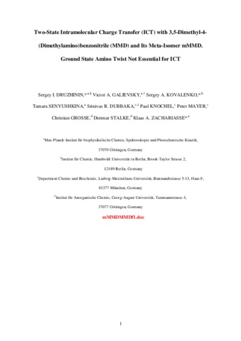 Druzhinin, Sergelj I. and Galievsky, Victor A. and Demeter, Attila and Kovalenko, S. A. and Senyushkina, Tamara (2015) Two-State Intramolecular Charge Transfer (ICT) with 3,5-Dimethyl-4-(dimethylamino)benzonitrile (MMD) and Its Meta-Isomer mMMD. Ground State Amino Twist Not Essential for ICT. Journal of Physical Chemistry A, 119 (49). pp. 11820-11836. ISSN 1089-5639