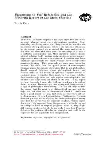 Paár, Tamás (2015) Disagreement, Self-Refutation and the Minority Report of the Meta-Skeptics. KRITERION — JOURNAL OF PHILOSOPHY, 2015 (29). pp. 23-44. ISSN 1019-8288