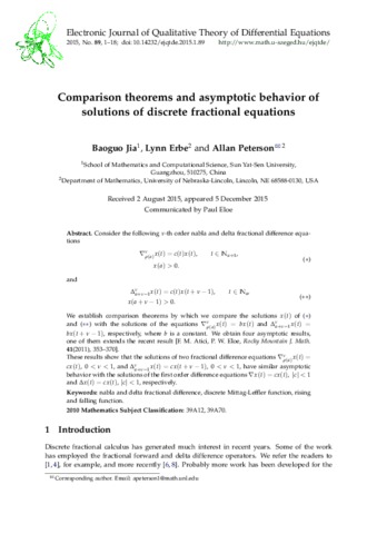 Jia, Baoguo and Erbe, Lynn and Peterson, Allan (2015) Comparison theorems and asymptotic behavior of solutions of discrete fractional equations. Electronic Journal of Qualitative Theory of Differential Equations, 2015 (89). pp. 1-18. ISSN 1417-3875