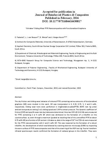Padenko, E. and van Rooyen, L. and Wetzel, B. and Karger-Kocsis, J. (2016) "Ultralow" sliding wear polytetrafluoro ethylene nanocomposites with functionalized graphene. Journal of Reinforced Plastics and Composites, 35 (11). pp. 892-901. ISSN 0731-6844 (Submitted)