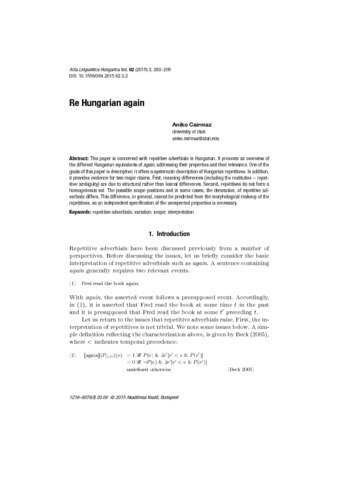 Csirmaz, Aniko (2015) Re Hungarian again. Acta Linguistica Hungarica, 62 (3). pp. 263-295. ISSN 1216-8076
