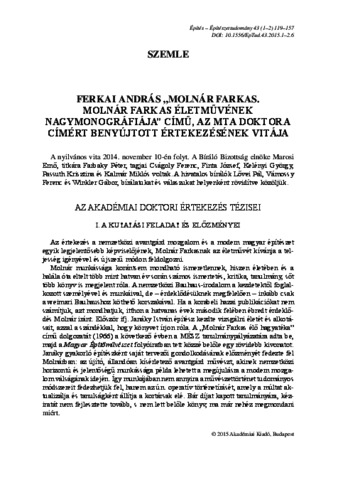 Ferkai, András (2015) Ferkai András „Molnár Farkas. Molnár Farkas életművének nagymonográfiája” című, az MTA doktora címért benyújtott értekezésének vitája. Építés - Építészettudomány, 43 (1-2). pp. 119-157. ISSN 0013-9661