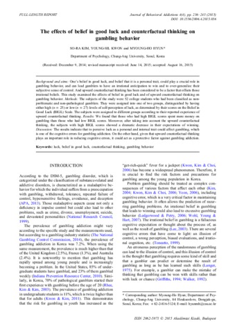 Kim, So-Ra and Kwon, Young-Sil and Hyun, Myoung-Ho (2015) The effects of belief in good luck and counterfactual thinking on gambling behavior. Journal of Behavioral Addictions, 4 (4). pp. 236-243. ISSN 2062-5871