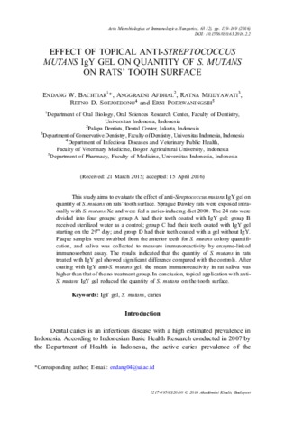 Bachtiar, Endang W. and Afdhal, Anggraeni and Meidyawati, Ratna and Soejoedono, Retno D. and Poerwaningsih, Erni (2016) Effect of topical anti-Streptococcus mutans IgY gel on quantity of S. mutans on rats’ tooth surface. Acta Microbiologica et Immunologica Hungarica, 63 (2). pp. 159-169. ISSN 1217-8950