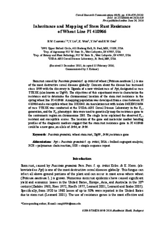 Campbell, B.W. and Liu, Y. and Wise, K. and Jin, Y. and Ohm, H.W. (2016) Inheritance and mapping of stem rust resistance of wheat line PI 410966. Cereal Research Communications, 44 (3). pp. 414-423. ISSN 0133-3720